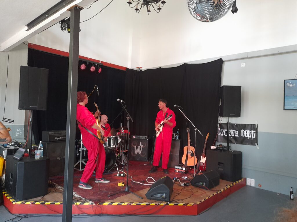 Weiter geht es mit dieser, komplett in rot gekleideten Band. Der Stil ist relativ schwer in Worte zu fassen. Laut der Bandcamp Seite von Beton de Rouge, handelt es sich um eine Mischung aus Rüttelbeton, Stampfbeton und Schockbeton. Die Begriffe habe ich jetzt zwar zum ersten Mal gehört, aber es klingt interessant. Ist es dann auch. Ziemlich punkige Texte in deutscher, französischer und englischer Sprache. Der Sound ist eher minimalistisch und ruhig gehalten, aber der Bass ist sehr präsent. Es gibt eine Leadsängerin, aber auch vom Schlagzeug kommt gelegentlich männliche Gesangsunterstützung. Thematisch für mich relativ kryptisch.