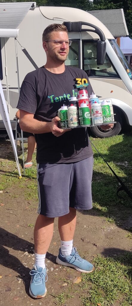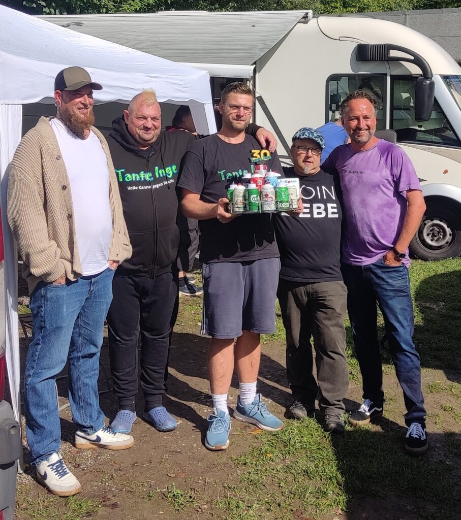 Wir haben uns dann in unser „Wohnzimmer“ zu Angi und Marc gesetzt, es wurde geredet, geplant, zwischenzeitlich von jedem das Camp eingerichtet, getrunken und bereits viel gelacht. Ab 15:45 Uhr kam dann langsam Bewegung in die Geschichte, ein weiterer Fan, besser gesagt DER „Lieblingsfan“ – ebenfalls Namens Marc – kam und überreichte der Band eine Bierdosen-Torte mit LED-Kerzen und einem 30 Jahre Tante Inge Schild oben drauf. Klasse Überraschung und die Band hat sich sichtlich gefreut. Die Zutaten der Torte waren noch eiskalt und so wurden die Kaltgetränke an das anwesende Volk verteilt, es wurde angestoßen und von allen noch einmal gratuliert.