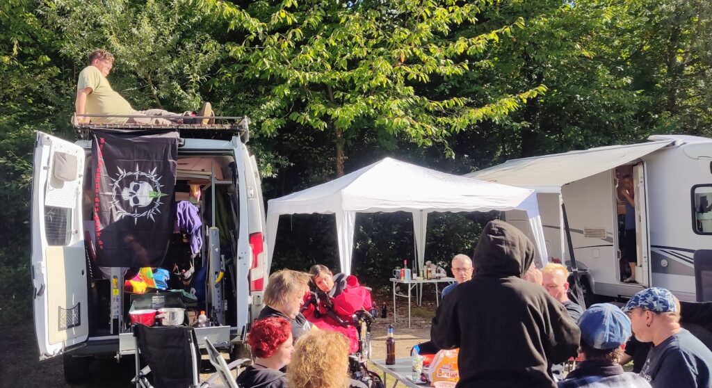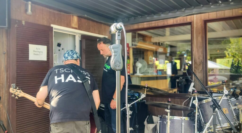 Da der Donnerstag ziemlich verregnet war und der Boden gut getränkt, haben wir uns dann dazu entschlossen, nach dem für mich sehr schönen Kennenlernen, witzigen Gesprächen und einer kleinen Vorfeier, auf den Zeltaufbau zu verzichten und im überraschend gemütlichen Auto zu schlafen. So ausgeruht und sofort mit frischem Kaffee vom WoMo nebenan versorgt, sind wir am Freitag dann gegen 11 Uhr zum Restaurant vom Campingplatz gelaufen um die Details zu klären, denn dort sollten die Gigs stattfinden. Schließlich wollten Band und Pöbel gegen 15 Uhr auf dem Platz eintrudeln und bis dahin wollten wir alles geklärt wissen.