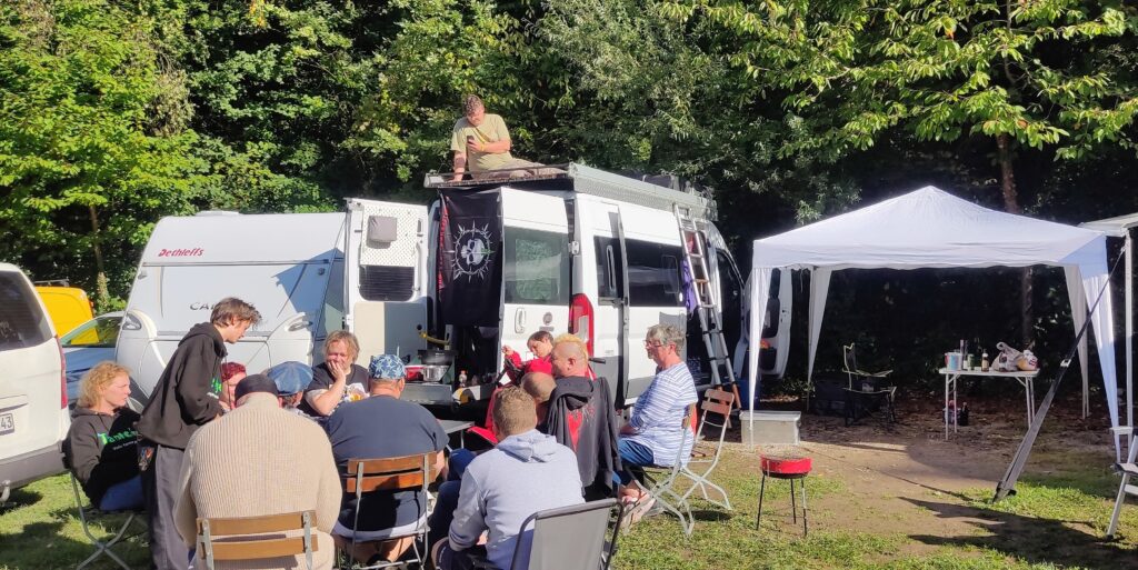Als ich am Samstag aus dem Auto gekrochen kam, waren die ersten schon wach am Platz, es gab erst einmal einen Kaffee für mich und auf dem Campingkocher stand bereits das Frühstück. Gerrit und Kathi hatten nämlich dafür gesorgt, dass wir mit einem zünftigen Weißwurst-Frühstück starten konnten und für die gesamte Mannschaft extra Wurst und Weißbier von zu Hause mitgebracht. Dankeschön hier auch an Euch beide, eine total liebe Aktion. Die Band hatte sich zudem um die frischen Brezeln gekümmert und so startete der Tag in gemütlicher Runde, mit gemeinsamen Frühstück, anstoßen hier und da, vielen Gesprächen, mal in großer, mal in kleiner Runde. Man lernte sich dadurch noch besser kennen und das Ganze hat die gemeinsame Zeit da schon zu einem Erlebnis, wie „mit alten Freunden“ gemacht.