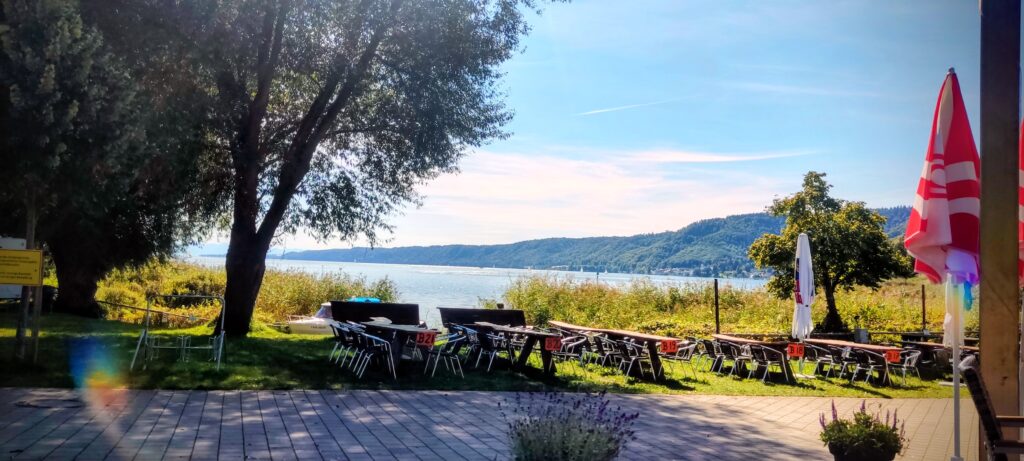Nach der kleinen Geburtstagsrunde wurde es dann auch allmählich zeit, zum Restaurant zu laufen. Die Band musste ja noch aufbauen, Soundcheck machen und die gesamte Meute war hungrig. Das Restaurant liegt mit seinem Außenbereich direkt am See und lange Tafeln laden zum verweilen ein. Es gibt eine für einen Campingplatz mehr als üppige Speisekarte. Von Snacks, über deutsche und asiatische Küche, Salate, vegetarisches und mehr. Das Ganze auch noch lecker und zu erschwinglichen Preisen, direkt am Bodensee. Klare Empfehlung!