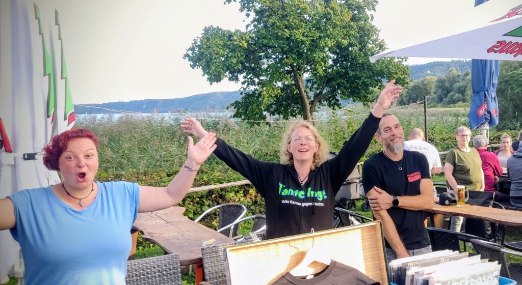 Auch Rita vom Vorabend war wieder anwesend. An beiden Abenden wurde auch klare Kante gegen Rechts gezeigt und deutlich gemacht, dass sich Tante Inge „Volle Kanne gegen Rechts“ stellt, wie es auch auf den aktuellen Merchprodukten zu lesen ist und es keinen Platz für Faschismus, Rassismus oder sonstiges ausgrenzendes Gedankengut gibt. Ich kann auf jeden Fall sagen, dass ich im Publikum niemanden gesehen habe, dem diese Ansage irgendwie aufgestoßen wäre oder sich darüber entrüstet hätte, was in meinen Augen wiederum für den Campingplatz und das Publikum dort spricht.