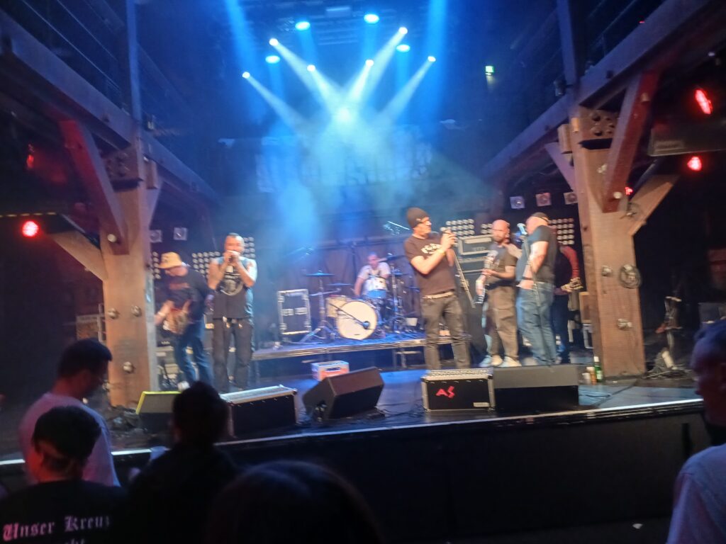 Ich für meinen Teil habe einen kurzen „Toten Punkt“ und schaue mir das Ganze entspannt aus sicherer Distanz an. Vorne geht es in Sachen Moshpit ordentlich ab. Die Leute kennen die Songs natürlich und singen laut mit. Von „Asozial“ bis „Polizeistaat„.