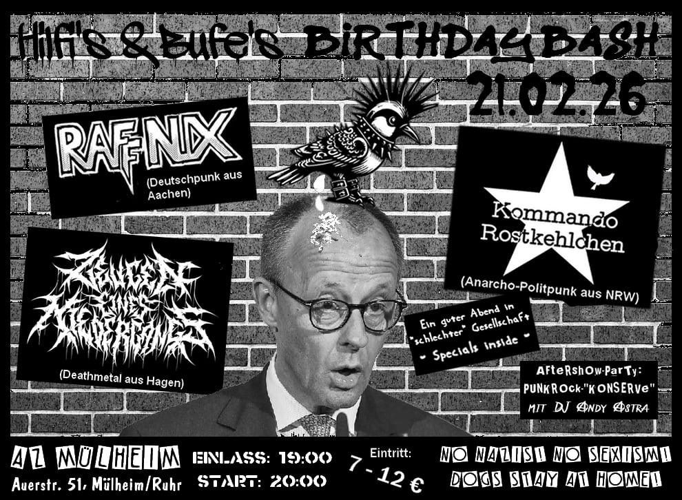 Weitere Informationen: Moin Leute! Der Flyer für Hilfi\’s und meinen nachträglichen \“Birthday-Bash\“ im Februar ist fertig! Es darf mit einer extrem geilen Party im AZ Mülheim (a.d. Ruhr) gerechnet werden! Jetzt heißt es: LIKEN! TEILEN! RUMKOMMEN! MITFEIERN! 🤘😎🍻