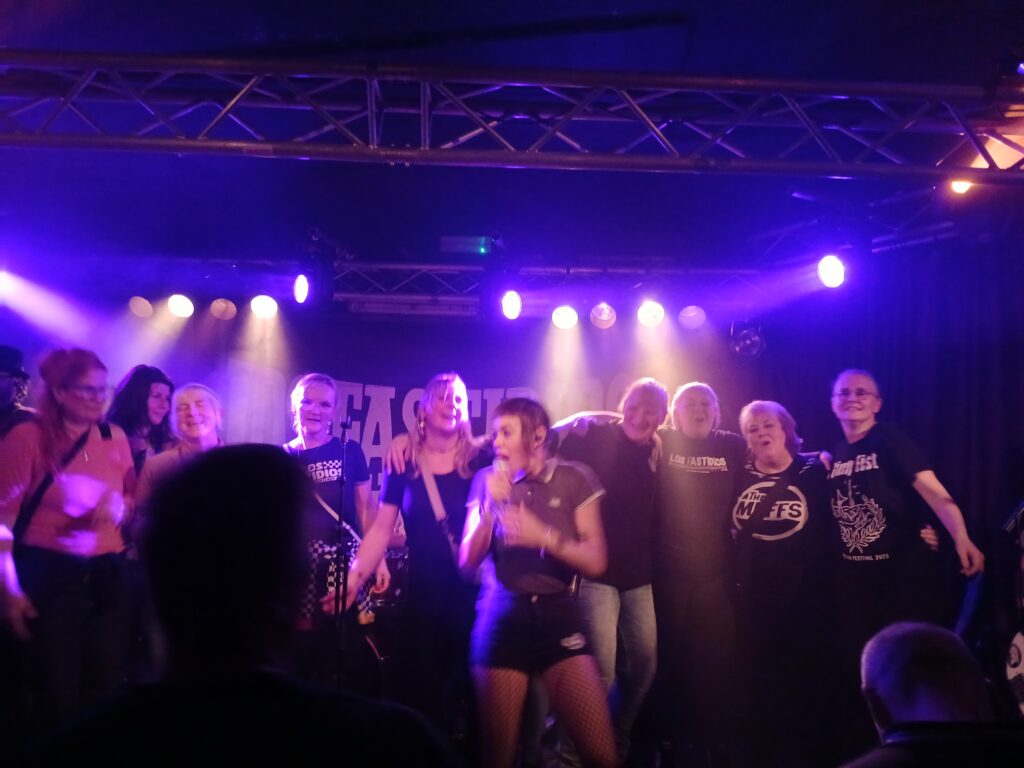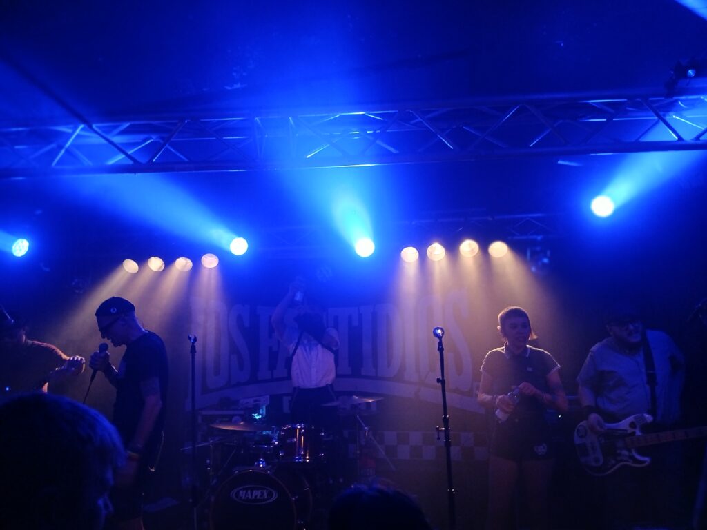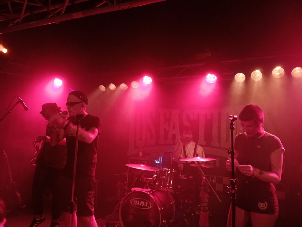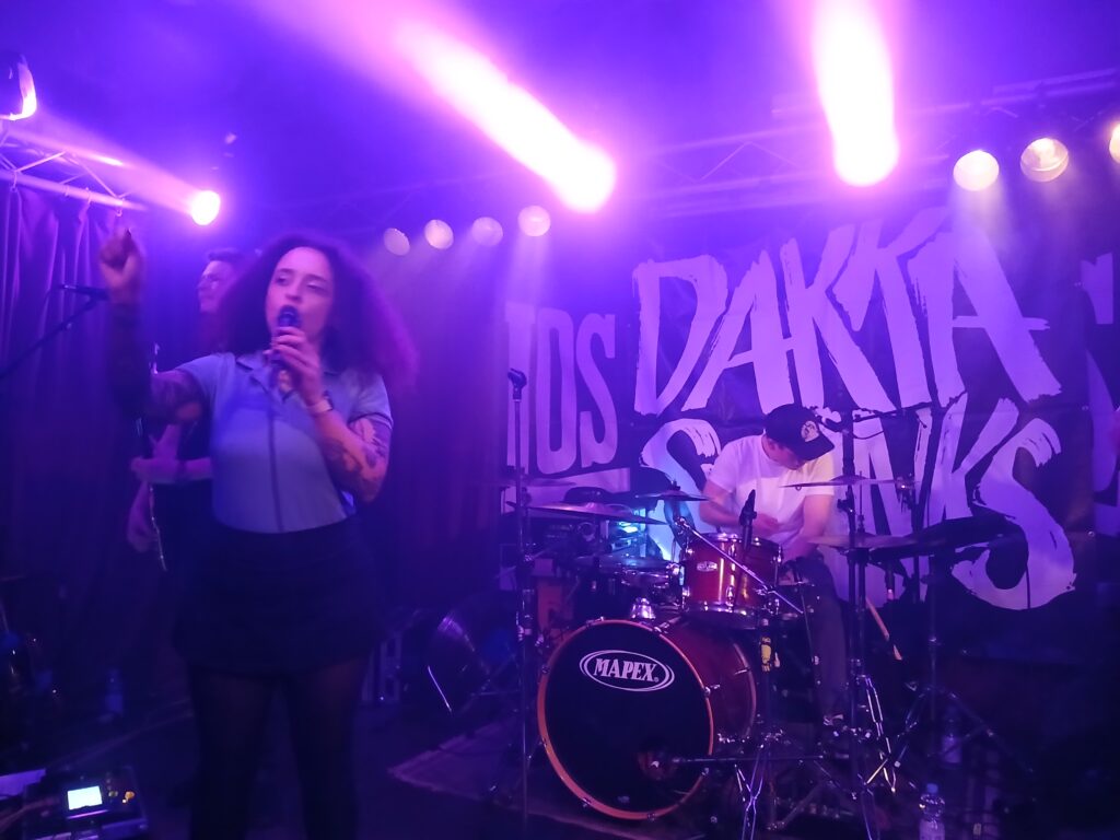 Gegen 20 Uhr geht es los mit einer Mischung aus Hard Reggae, Ska, Dub und Punk. Dakka Skanks sind eine Sängerin und vier Herren an den Instrumenten. Die Band kommt aus Brighton und das hört man auch sofort in der Stimme von Sängerin Clara. Optisch und thematisch haben es einen starken Bezug zum „Skinhead Movement“. Es geht gegen die pauschale Stigmatisierung der Szene und die Unterwanderung von „Rechts“. Sie beziehen auch klar Stellung gegen die natürlich real existierenden „Right Wing Skins“ oder besser gesagt „Boneheads“. Besonders deutlich wird das im Song Ain’t a Skinhead. Hier heißt es unter anderem :