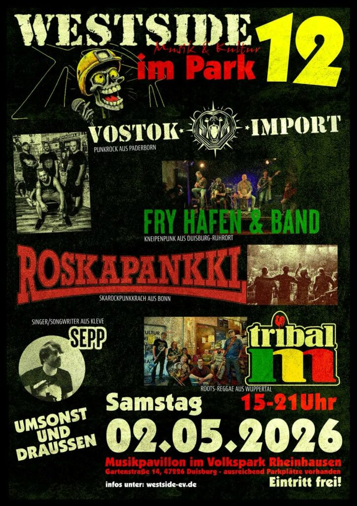 Am Samstag, 2. Mai 2026, gibt’s die nächste Runde WESTSIDE im PARK am Musikpavillon im Volkspark Rheinhausen. Eintritt frei, frische Luft, kalte Getränke und ein bunt zusammengewürfeltes Line-up zwischen Singer/Songwriter, Punk, Ska, Reggae und Ruhrpott-Charme. Der Pavillon liegt an der Gartenstraße 14 in 47226 Duisburg.